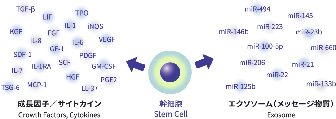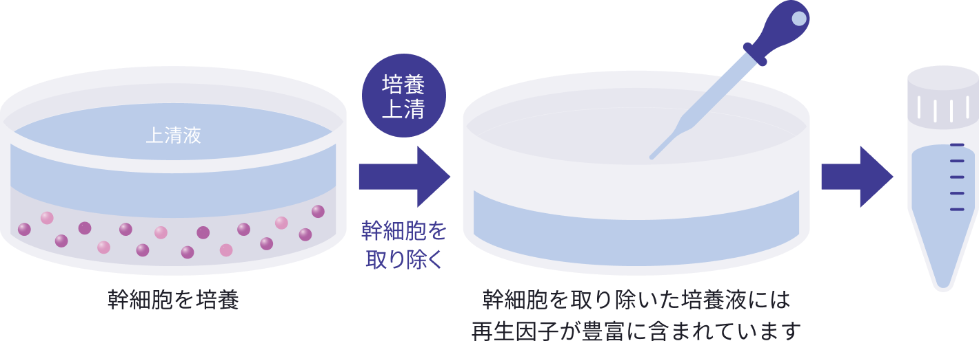 幹細胞を培養液内で培養すると、幹細胞から様々な「成長因子(細胞の成長、増殖を促進するタンパク質)」や「サイトカイン(生理活性物質)」、「エクソソーム(細胞や組織に働きかけて生体をコントロールするメッセージ物質)」が培養液内に分泌されます。培養後、幹細胞を除いた上澄み液のみを採取したものが、幹細胞培養上清液です。