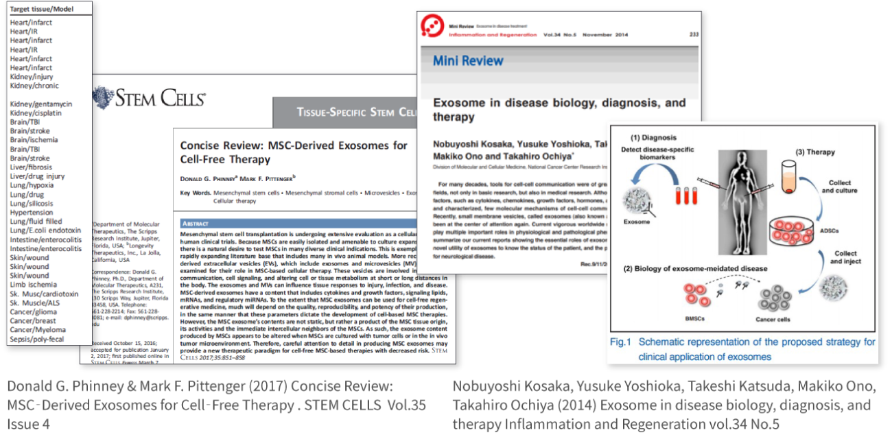 エクソソームは、細胞を用いない治療として様々な疾患を対象に臨床研究が進んでおり、治療・診断・病理など、その応用範囲も多岐にわたっています。